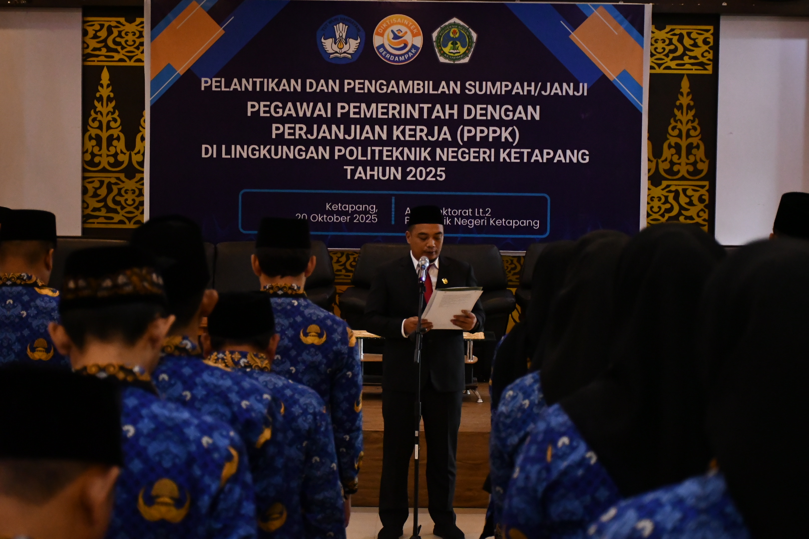 Ketapang, 20 Oktober 2025 – Sebanyak 44 pegawai Politeknik Negeri Ketapang (Politap) resmi dilantik dan diambil sumpahnya sebagai Aparatur Sipil Negara (ASN) pada Senin, 20 Oktober 2025. Dari total peserta, satu di antaranya merupakan PPPK paruh waktu yang turut diambil sumpahnya secara resmi.