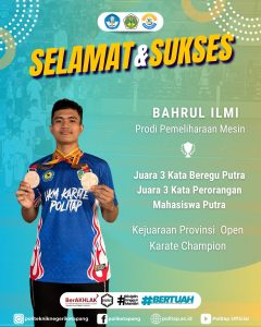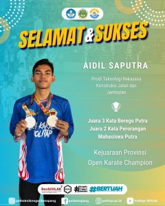 Pontianak, 16 November 2025 – Dua mahasiswa kembali mengharumkan nama kampus Politeknik Negeri Ketapang melalui prestasi gemilang pada Kejuaraan Provinsi Open Karate Champion. Ialah Aidil Saputra dari Program Studi Teknologi Rekayasa Konstruksi Jalan (TRKJJ) dan Jembatan, serta Bahrul Ilmi dari Program Studi Pemeliharaan Mesin.