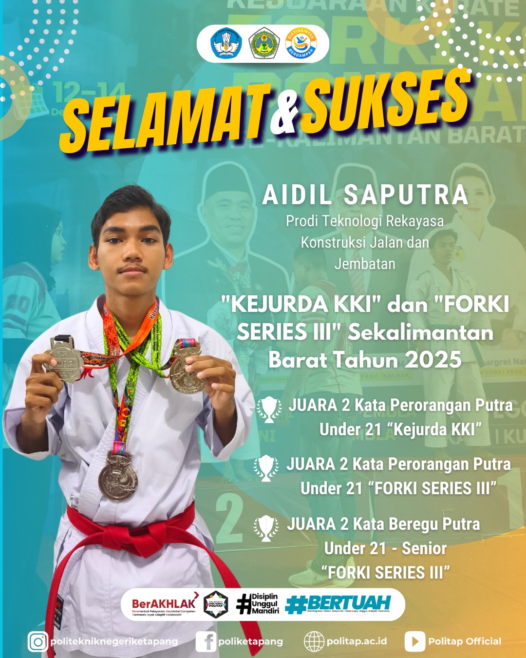 Aidil Saputra, mahasiswa Program Studi Teknologi Rekayasa Konstruksi Jalan dan Jembatan, berhasil meraih sejumlah prestasi gemilang. Pada ajang KEJURDA KKI, ia meraih Juara 2 Kata Perorangan Putra Under 21. Sementara itu, pada FORKI Series III, Aidil kembali menorehkan prestasi dengan meraih Juara 2 Kata Beregu Putra Under 21–Senior serta Juara 2 Kata Perorangan Putra Under 21.