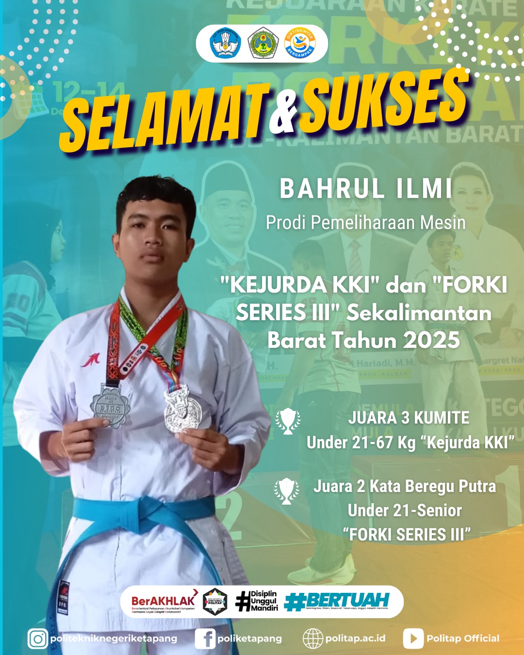 Prestasi selanjutnya diraih oleh Bahrul Ilmi, mahasiswa Program Studi Pemeliharaan Mesin. Pada KEJURDA KKI, Bahrul berhasil meraih Juara 3 Kumite Under 21 -67 Kg Putra. Selain itu, pada FORKI Series III, ia turut berkontribusi dalam perolehan Juara 2 Kata Beregu Putra Under 21–Senior.