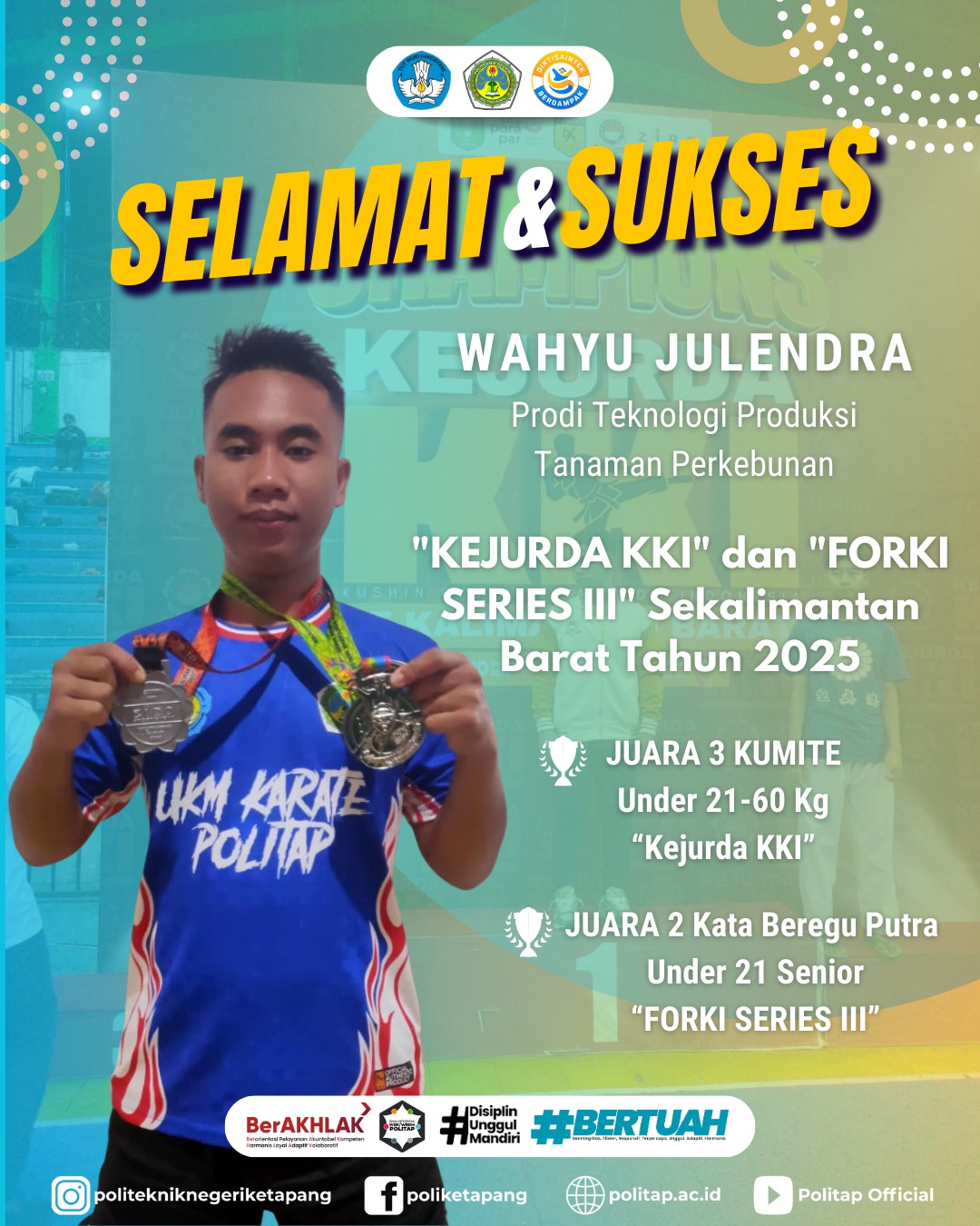 Mahasiswa berprestasi lainnya adalah Wahyu Julendra dari Program Studi Teknologi Produksi Tanaman Perkebunan. Wahyu berhasil meraih Juara 3 Kumite Under 21 -60 Kg Putra pada ajang KEJURDA KKI. Ia juga menambah daftar prestasi dengan meraih Juara 2 Kata Beregu Putra Under 21–Senior pada FORKI Series III.