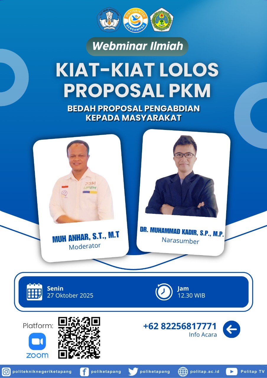 Kegiatan hari pertama yang dilaksanakan pada Senin, 27 Oktober 2025, mengangkat tema “Kiat-Kiat Lolos Proposal PKM: Bedah Proposal Pengabdian kepada Masyarakat”. Webinar menghadirkan Dr. Muhammad Kadir, S.P., M.P. dari Politeknik Pertanian Negeri Pangkajene Kepulauan (Polipangkep) sebagai narasumber, dengan Muh Anhar, S.T., M.T. dari Politap sebagai moderator.